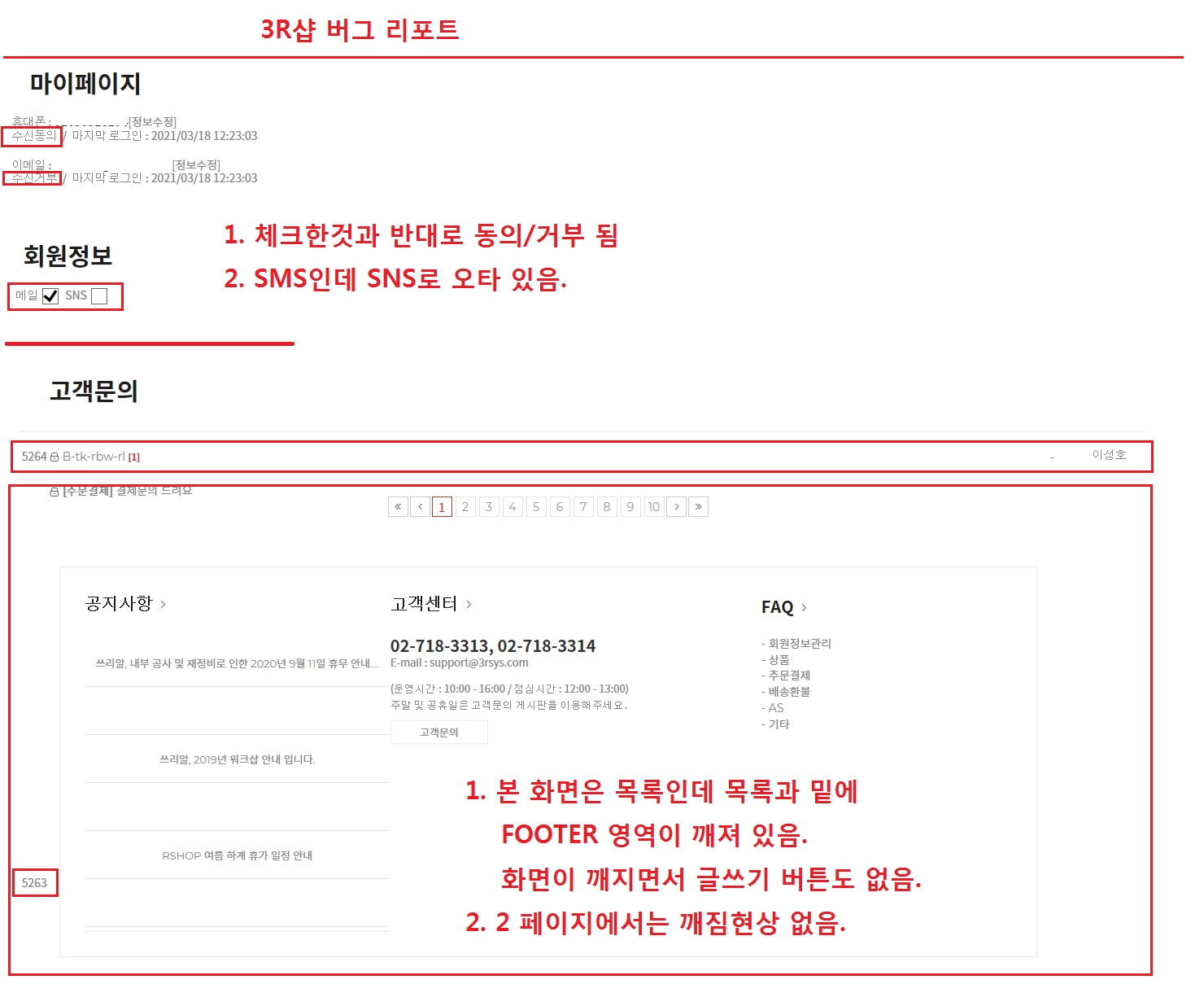 1. 회원정보 - 수신동의 (메일 및 sms 체크 버그) / SMS인데 SNS로 오타 있음.