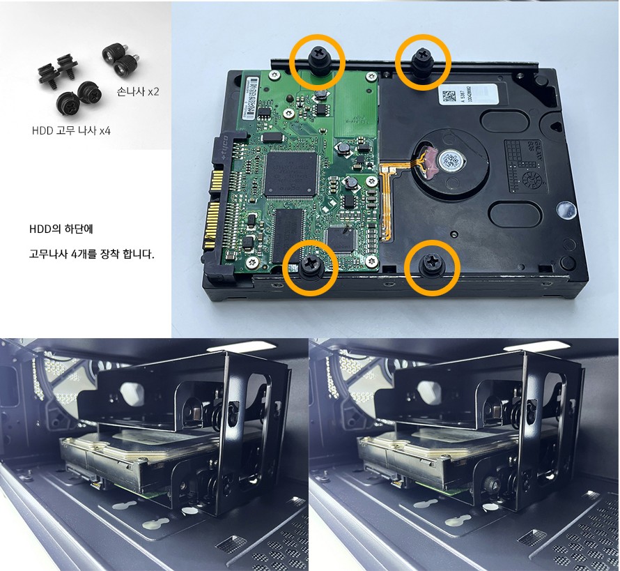 제품을 받아보니 전면에 알루미늄 패널이 충격받은듯 구부러져있고 패널 고정핀이 두개가 부러져 굴러다니더군요. 유격이 좀 있지만 패널 고정에는 무리가 없어서 알루미늄 패널만 제가 대충 펴서 쓰는 중입니다. 근데 제 파워가 긴 편이라 하노킬 베이를 전면쪽으로 옮겨 달아보려는데 기존 나사가 계속 헛돌고 고정이 안됩니다. 그래서 이거 저거 써보다가 고무나사 4개를 써서 겨우 고정시켰습니다. 덕분에 하드 2개를 장착하는데 고무나사가 모자라 2개씩 달아서 장착해놨네요. 그리고 사진상의 손나사는 아무리 찾아도 안보입니다.