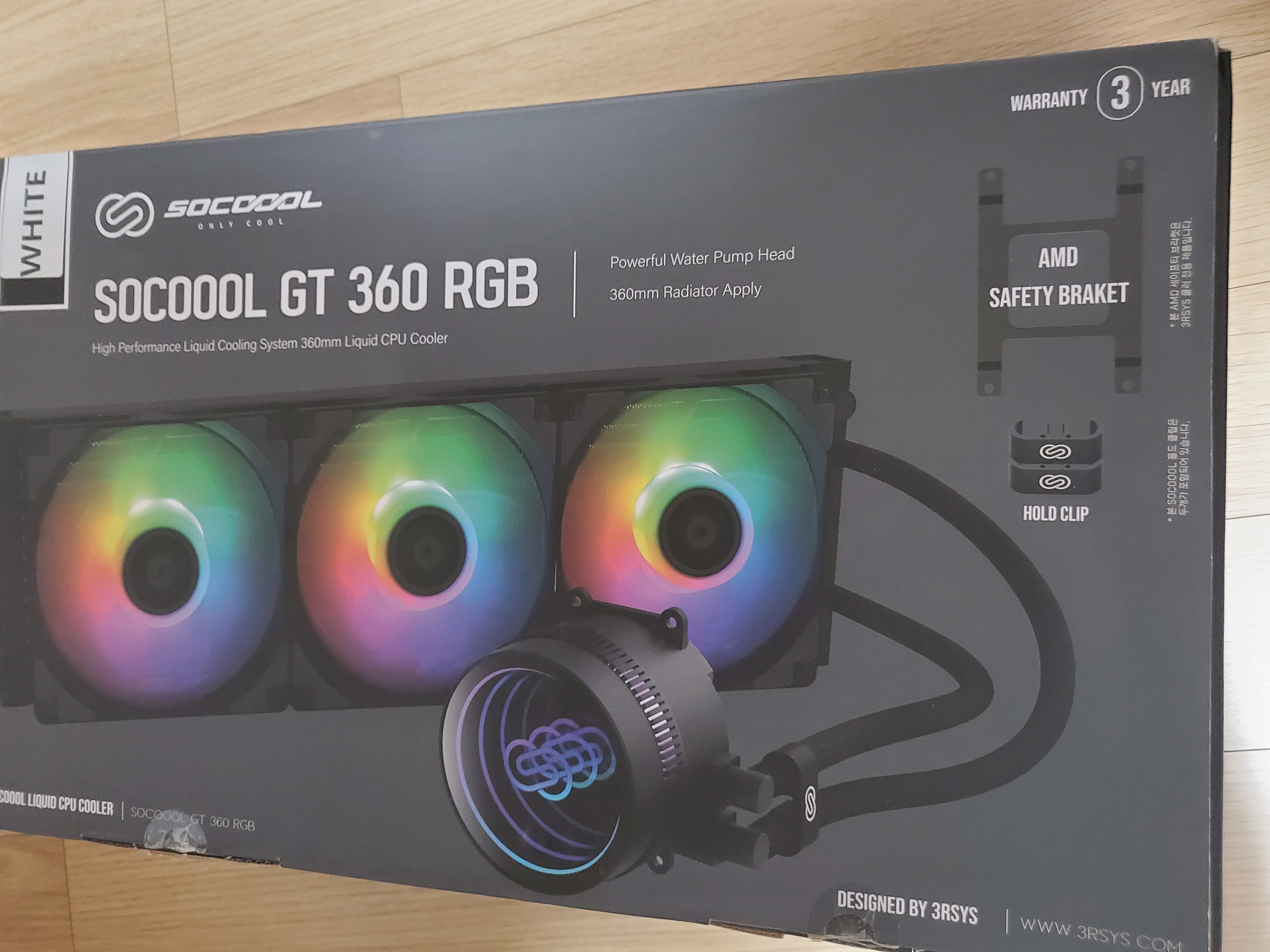 CPU 쿨러 / 수랭 / 팬 쿨러 / 팬 크기: 120mm / 25T / 최대 소음도: 최대 32dBA / 1800 RPM / 최대 풍량: 81.72 CFM / 최대 풍압: 2.28 mmH2O / 라디에이터: 3열 / 397mm / LGA1700 / LGA2066 / LGA2011-V3 / LGA2011 / LGA1200 / LGA115x / LGA775 / AM4 / LED 라이트 / 6년 / AMD SAFETY 브라켓 제공